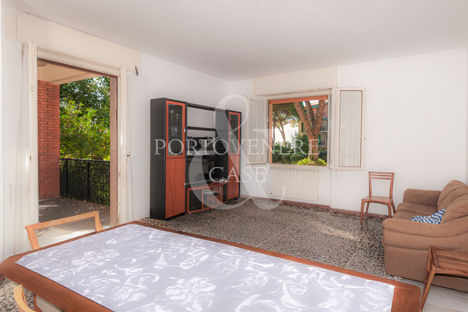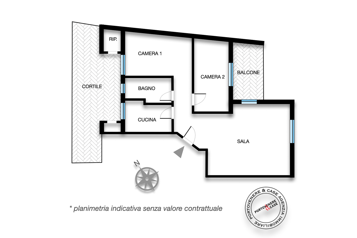 L’immobile presenta una distribuzione razionale degli ambienti e una doppia esposizione esterna che ne aumenta la fruibilità. La zona living e una delle camere da letto hanno accesso diretto al balconcino con vista mare, offrendo uno spazio esterno con affaccio aperto e gradevole. La cucina e la seconda camera si collegano invece al cortile, ambiente riservato che amplia la vivibilità dell’abitazione e consente un utilizzo flessibile durante tutto l’anno.